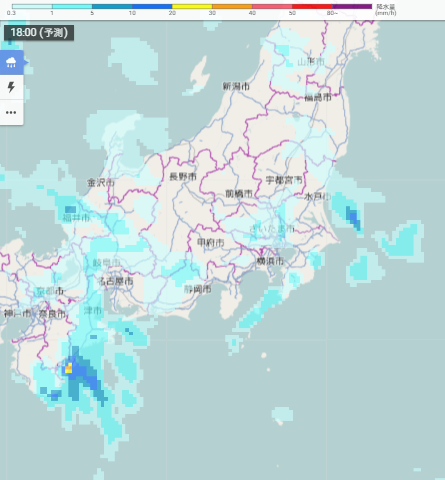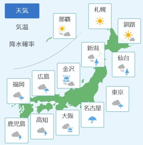 各地で雨が降りやすく、傘が手放せない一日となるでしょう。北陸や東海では雷を伴った激しい雨の降る所があるため、落雷や突風、降ひょうに注意してください。関東では南部ほど雨が降りやすく、一時的に雨脚が強まる見込みです。