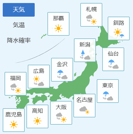 北海道では、道南や道東は晴れるでしょう。道央と道北は、雲が多いですが、次第に晴れる見込みです。東北は雲が広がって、日中は各地で雨が降るでしょう。お出かけの際は傘をお持ちください。東北南部の太平洋側では、船舶は高波と強風に注意してください。