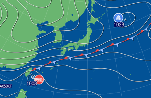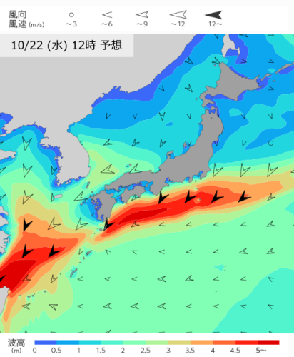 伊豆諸島~九州南海上の前線近傍では北東の風が強く波が高いでしょう。うねりを伴う高波に注意してください。