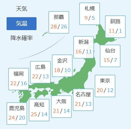 日中の気温は、北日本は寒いので、暖かくしてお過ごしください。東北南部、東日本と西日本では、昨日より上がり過ごしやすいですが、明け方は冷え込んで日中との気温差が大きくなります。着るもので、上手に調節してください。沖縄奄美では、広い範囲で真夏日の予想です。こまめな休憩と水分補給をお忘れなく。