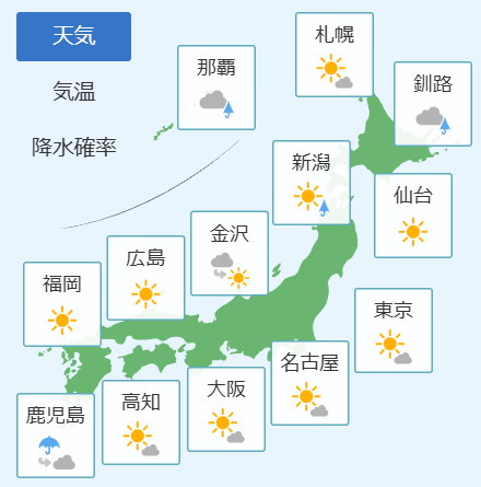北海道は雲が広がり、日本海側は所により雨、オホーツク海側では所により雨や雪が降るでしょう。東北、東日本や西日本では概ね晴れる見込みです。伊豆諸島は曇りで雨が降り、伊豆諸島南部では所により雷を伴うでしょう。九州南部では夕方頃まで雨が降る見込みです。種子島・屋久島地方、奄美と沖縄本島、宮古島と石垣島では、雨が降りやすく、所により雷を伴って激しい雨が降る恐れがあります。土砂災害、低い土地の浸水、河川の増水、強風、落雷、竜巻などの激しい突風、短時間の強い雨に警戒注意が必要です。東日本と西日本の太平洋側、九州北部と九州南部、奄美と沖縄地方の沿岸と周辺海域ではうねりを伴い波が高くなっています。船舶は、高波と強風に警戒注意してください。