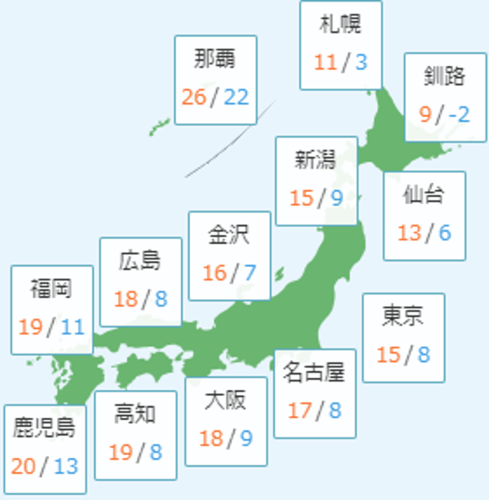 日中の最高気温は、北陸は昨日と同じくらいか高く17℃前後の気温、関東や東海は昨日と同じくらいか低く、関東は17℃前後の気温、東海は18℃前後の気温となる所が多い見込みです。朝晩は冷え込み、コート等の上着での調節がよさそうです。