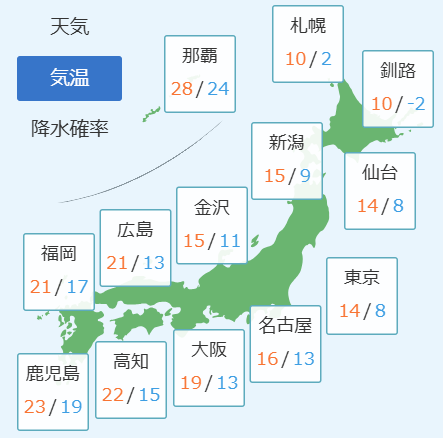 日中の気温は、奄美と沖縄地方では夏日が続く予想です。こまめな水分補給をお忘れなく。