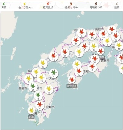 広い範囲で日差しが届き、行楽や紅葉狩りに適した天気となるでしょう。ただし、山陰では雲が広がりやすく、パラッと降る可能性があるため、外出の際は折りたたみ傘があると安心です。