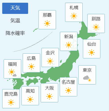 日中の最高気温は、北海道では10℃前後の所が多く、函館では13℃まで上がるでしょう。東北は北部で12℃~13℃、南部は13℃~17℃位の予想です。