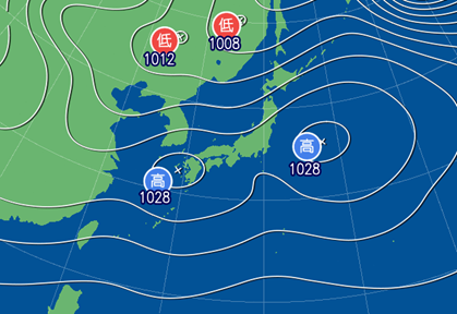 日本付近は移動性の高気圧に覆われてきています。このため、全国的に晴れる所が多いですが、北日本の日本海側や関東では気圧の谷や湿った空気の影響で雲が広がりやすく、一部で雨が降る所もあるでしょう。