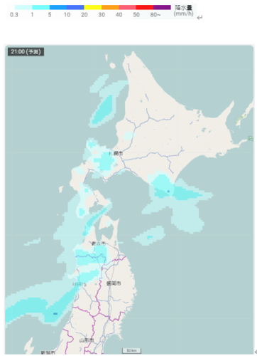 北日本付近の雨雲や雪雲の予想(12月3日21時)