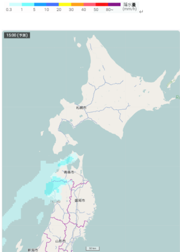 北日本付近の雨雲や雪雲の予想(12月3日15時)