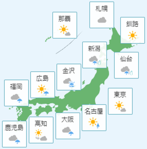 日本海の低気圧は次第に不明瞭化するものの、東北から西日本にかけて気圧の谷が通過する影響により、東北や北陸、山陰は曇りのち時々雨や雪、東海や西日本のその他の地域は午前中晴れ間もあるものの概ね曇りで、気圧の谷の通過時を中心に雨が降る見込みです。関東は気圧の谷の影響は少なく、晴れのち概ね曇りの天気となる所が多いでしょう。北海道は寒気の影響により、日本海側では曇り時々雪、太平洋側では概ね晴れる見込みです。南西諸島は高気圧に覆われ概ね晴れる所が多いものの、にわか雨が降る所もありそうです。