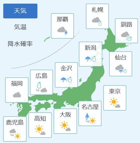 日中の最高気温は、関東甲信や東海では8℃から11℃、北陸では4℃前後の見込みです。ダウンコートに手袋やマフラーなどで防寒、防風対策を万全にしてお出かけください。