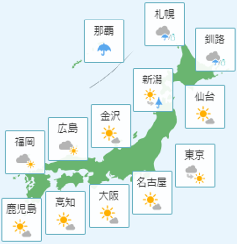 日本海側や東北北部以北では、朝方晴れている所も次第に雲が多くなり、断続的に雨や雪が降る天気となるでしょう。日本海側を中心に、落雷や突風・竜巻、強風、降ひょう、局地的な強い雨、融雪、北海道や東北の山沿いでは雪となる所が多く吹雪や積雪、落雪、雪崩等にも注意が必要です。東北南部の太平洋側では雲が出やすいものの概ね晴れる所が多そうです。