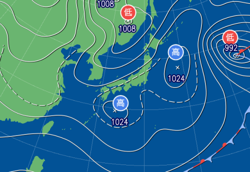 高気圧の周辺部にあたり湿った空気が流れ込みやすく、曇りや雨の天気となる所が多いでしょう。雷を伴う所もありそうで、落雷や突風、急な強い雨等に注意してください。