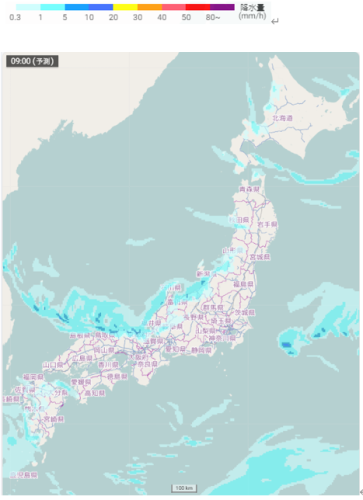 日本付近の雪雲や雨雲の予想(1月2日09時)