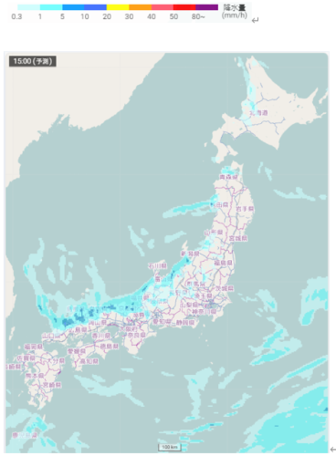 日本付近の雪雲や雨雲の予想(1月2日15時)