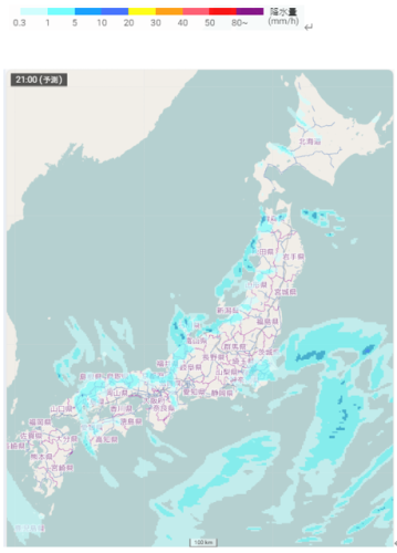 日本付近の雪雲や雨雲の予想(1月2日21時)
