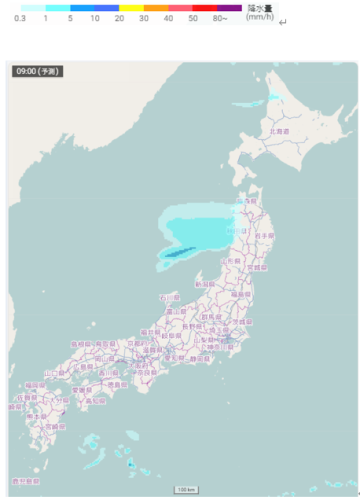 日本付近の雪雲や雨雲の予想(1月17日09時)