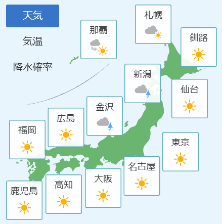 北海道の日本海側は雪、東北と北陸では雪や雨が降るでしょう。東北の日本海側では、所により吹雪や雷、北陸では所により雷を伴う見込みです。落雷、竜巻などの激しい突風注意して下さい。東北南部、関東と山梨県や東海、西日本は、太平洋側を中心に広く晴れるでしょう。奄美は曇りで所により雨、沖縄地方は晴れるものの、宮古島と石垣島では、にわか雨が降る見込みです。北日本と北陸の沿岸と周辺海域では、船舶は高波と強風注意してください。
