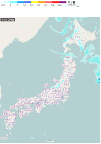 日本付近の雪雲や雨雲の予想(1月17日21時)