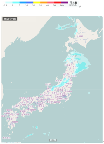 日本付近の雪雲や雨雲の予想(1月17日15時)