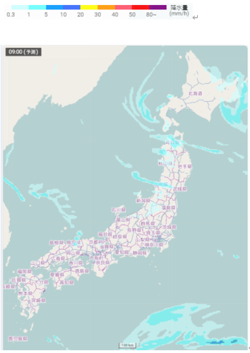 日本付近の雪雲や雨雲の予想(1月28日09時)