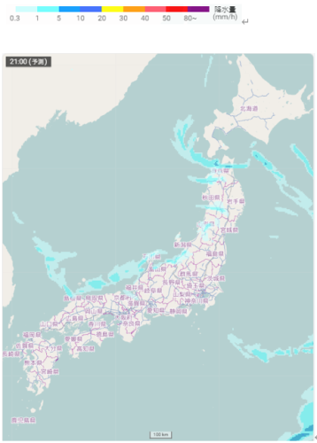 日本付近の雪雲や雨雲の予想(1月28日21時)