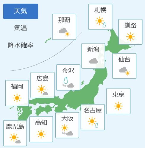 北陸、長野県や岐阜県の山沿いの雪は午前中のうちに止み、午後は晴れ間の出る所が多くなる見込みです。その他の地域は乾燥した冬晴れとなり、洗濯物は早い時間に乾くでしょう。