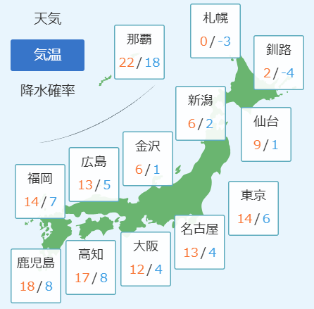 明け方は広く冷えこみ、日中は北風が吹いて寒いでしょう。外出の際はダウンやコート、帽子や手袋、マフラーなどの十分な防寒防風対策をしてお出かけください。 沖縄地方では、各地で夏日前後の予想です。こまめな水分補給や休憩などの熱中症対策をお忘れなく。