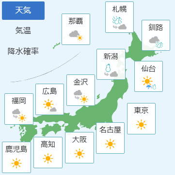 日本海側の天候は夕方頃には回復する見込みです。降雪量が多くなっている地域もありますので、屋根からの落雪や足元の凍結には十分ご注意ください。日中の最高気温は、昨日に比べ北海道は3℃前後、東北は7℃前後低くなる見込みです。日中は西寄りの風がやや強く、体感温度は一段と下がりそうです。外出の際は、風を通しにくい暖かいアウターを選ぶと安心です。