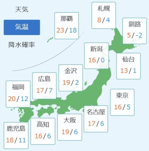 日中は晴れる所が多いものの、北海道の太平洋側では、夜には雨や湿った雪となる所があるでしょう。日本海側では朝から南よりの風が強まり、夜には暴風並みの風が吹き荒れるおそれがあります。屋外の物が飛ばされないよう、早めに屋内に片づけておくと安心です。日中の最高気温は、道東の太平洋側で5℃くらい、その他の北海道では8℃から12℃前後、東北では15℃前後で、福島では18℃の見込みです。朝晩との気温差が大きくなるため、調整のしやすい上着があると良いでしょう。