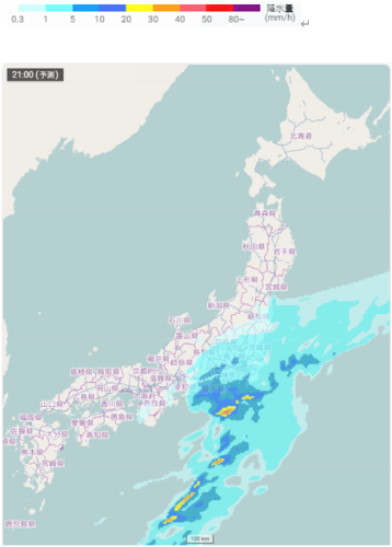 日本付近の雨雲の予想(2月25日21時)