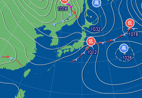 前線を伴った低気圧は関東の東海上に達し、その後さらに発達しながらゆっくり北上していく見込みです。そのため西~北日本の広い範囲で晴れるものの、次第に東シナ海で気圧の谷が深まる影響により、夜のはじめ頃より西から雲が広がってくるでしょう。九州では夜遅くには雨が降る所がありそうです。南西諸島は気圧の谷の影響により概ね曇り、一時的に雨が降る所がある見込みです。