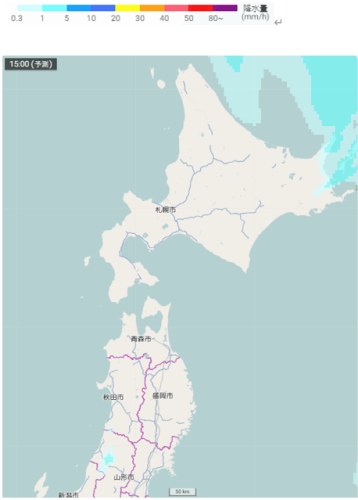 北日本付近の雪雲や雨雲の予想(2月28日15時)