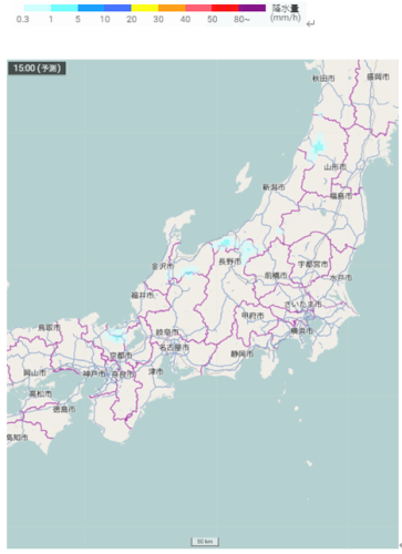 東日本と近畿付近の雨雲や雪雲の予想(2月28日15時)
