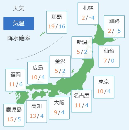 関東北部は朝まで雪が降りやすく、平地でも積雪となる可能性があります。交通機関の乱れに備え、通勤・通学は時間に余裕をもつとよいでしょう。北陸は雲が多く、雨や雪が降りやすい天気となる見込みです。雷や突風の可能性があるため、外での作業やレジャーは天気の急変に注意が必要です。甲信や東海は日差しが出る時間帯もありますが、にわか雨の可能性があります。折りたたみ傘があると安心です。最高気温は東京が10℃、名古屋が11℃の予想です。