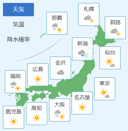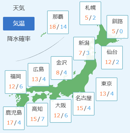 北日本と北陸では、明け方は冷えこみ、日中も寒いでしょう。暖かくして、お過ごしください。関東甲信と東海、西日本は日射しがあって、過ごしやすい見込みです。奄美と 沖縄地方では、北東の風が吹いて少し寒いでしょう。一枚、羽織るものがあると良さそうです。
