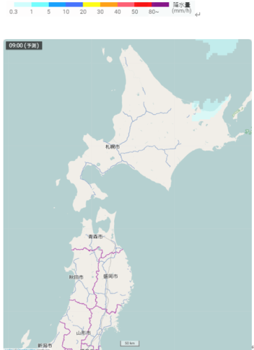 北日本付近の雪雲や雨雲の予想(3月14日09時)
