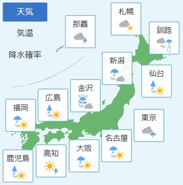 天気は回復傾向で、東海は昼前から晴れてくるでしょう。関東甲信の雨は昼頃までに止む所が多い予想です。帰りに傘を忘れない様、お気を付け下さい。北陸は夕方まで雨が残る所がありそうです。