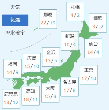 日中の気温は、北海道は5℃前後の所が多いでしょう。東北は青森、秋田、盛岡は11℃前後、仙台、山形、福島は14℃前後の予想です。
