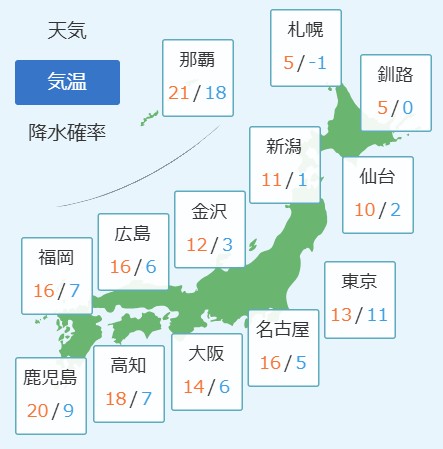 関東は雲が広がりやすく、気温は昨日より低くなり、肌寒さを感じる一日となる見込みです。薄着をして風邪など引かないようにご注意ください。その他の地域では日中は晴れ間が出る見通しです。ただし夜になると前線の影響を受ける北陸では雨や雪が降るでしょう。雷や突風、積雪地ではなだれにご注意ください。最高気温は東京が13℃、名古屋が16℃の予想です。