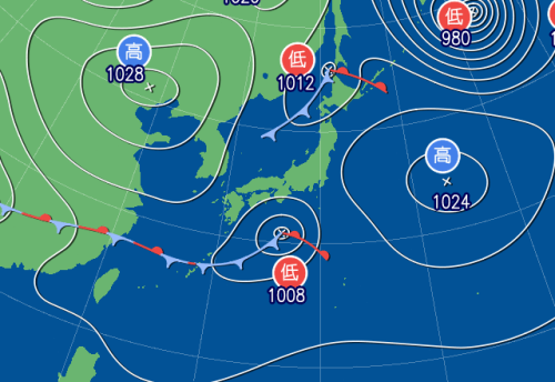 南海上及び宗谷海峡付近にある前線を伴った低気圧は、やや発達しながら東進していく見込みです。そのため西から天気は回復し東日本の南岸の雨も次第に止んでくるものの、北陸では寒気の影響により回復は遅れそうです。北海道は前線通過時に、雨や雪が降る所があるでしょう。南西諸島は前線の影響により、曇りや雨の天気となりそうです。