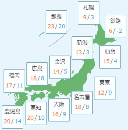 日中の最高気温は、北海道は昨日と同じくらいか高く、北海道北部や東部の太平洋沿岸地域では6℃前後の気温、北海道のその他の地域は9~12℃の気温、東北は昨日より高く14~17℃の気温となる所が多い見込みです。