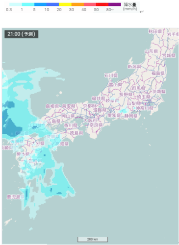 東日本と西日本付近の雨雲の予想(3月30日21時)