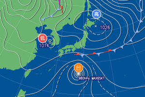 奄美と沖縄本島は時々晴れ間が出るでしょう。一方、石垣島と宮古島は湿った空気の影響で雨が降り、一時雷を伴い激しく降る見込みです。沿岸海上はうねりを伴った高波に注意して下さい。
