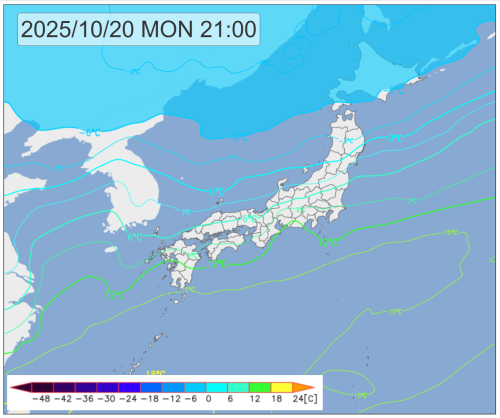平地で雪の目安の寒気(水色)が北海道に流れ込む