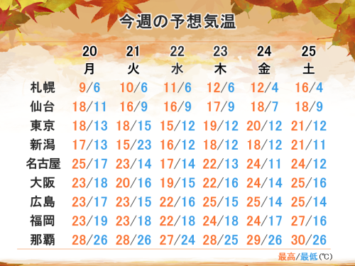 関東の内陸でも週の後半は最低気温が10℃を下回る所もある予想で、暖房がほしいくらいとなるでしょう。東京では日中も気温が20℃に届かない日が多く、22日(水)の最高気温は15℃の予想で肌寒く感じられる見込みです。
