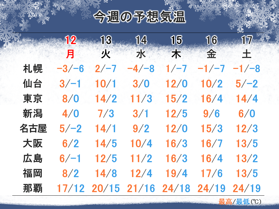 今週は寒暖の差が大きい1週間となりそうです。12日(月)は前日の寒気の影響が残り、朝の冷え込みが厳しいでしょう。路面凍結による交通障害に十分ご注意ください。日中も気温が上がらず冷たい風が吹く見込みです。万全な防寒対策をしてお出かけください。