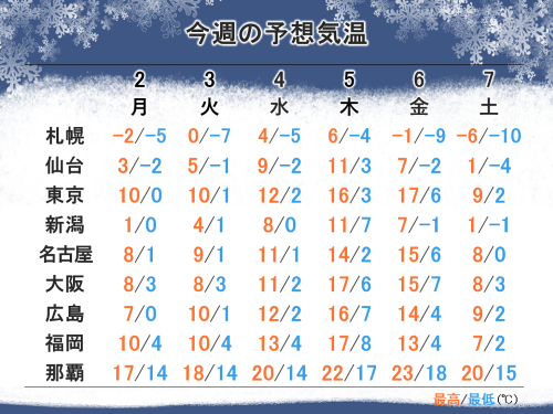 ・立春の頃に一時的に寒さが緩むが、週末は気温ダウン。寒暖差に注意。