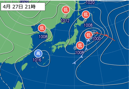 ↓4月27日(月)~5月2日(土)の予想気圧配置図↓