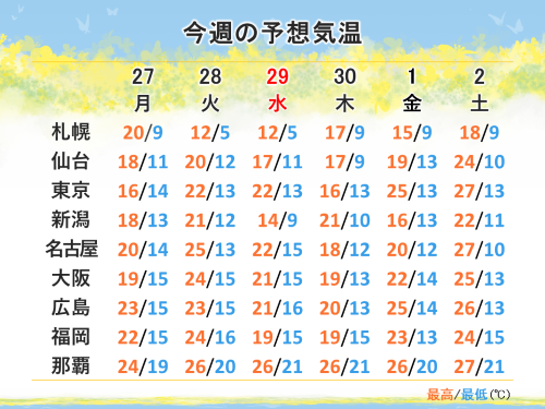 今週は、晴れる日には日差しに恵まれ気温が上がり、最高気温が25℃以上の夏日の所もあるでしょう。こまめな水分補給や帽子・日傘の活用など、暑さ対策が必要です。一方、曇りや雨の日は気温が上がらず、20℃を下回る所もあり、雨が冷たく感じられるでしょう。週の半ばごろには北海道で気温がぐっと低くなり、雪になる所もありそうなので注意してください。今週は天気も気温も安定しないため、日々の寒暖差に注意が必要です。また、晴れる日は朝晩と日中の気温差もあるため、引き続き服装で調節して体調を崩さないよう気を付けてください。