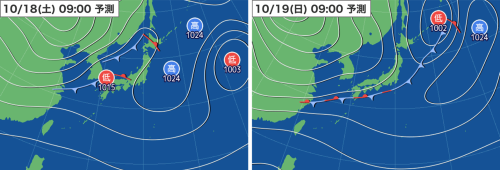 18日(土)になると、再び低気圧や前線が西から近づきます。全国的に曇りや雨のすっきりしない天気となって、東北~近畿北部の日本海側では激しい雨の降るところがあるでしょう。関東では午前中のうちは日差しが届きますが、次第に天気は下り坂で夜は雨が降り出す予想です。19日(日)も秋雨前線や湿った空気の影響を受け、広い範囲で曇りや雨のすっきりしない天気となるでしょう。一時的に冬型の気圧配置となり、北よりの風が強まる見込みです。なお、秋雨前線の動向によって予報に変化があるため、最新の気象情報にご留意ください。